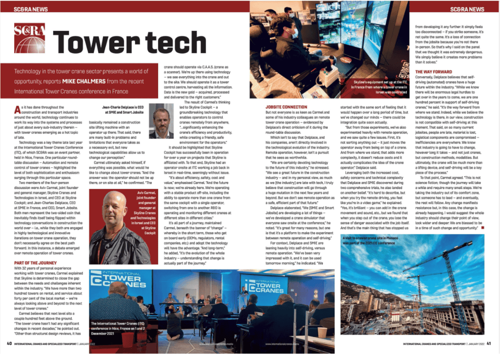 אביב כרמל, מנכל משותף בסקייליין עגורנים ומנכ"ל סקייליין קוקפיט, שופך אור על נושא השליטה והבקרה מרחוק בעגורני צריח, באחד מכתבי העת היוקרתיים והמקצועיים ביותר בענף העגורנים והבניה העולמי, International Cranes and Specialized Transport.